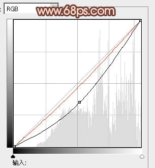 5、创建曲线调整图层,对RGB,红进行调整,参数设置如图14,确定后把蒙版填充红色,用白色画笔把水面部分擦出来,效果如图15。这一步把水面稍微调暗一点。