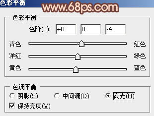 12、在图层的最上面创建色彩平衡调整图层,对阴影,高光进行调整,参数设置如图29,30。效果如图31。这一步加强图片的红色。