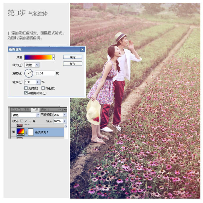 1、添加彩虹色渐变层,图层混合模式为“滤色”,不透明度改为:25%,为图片添加温暖色调。