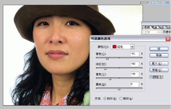 5.这个时候我们观察到图片里的女人皮肤好象有红色的冻斑,很不美观,所以应该把红色部分调淡,选择调整层---可选颜色,参数如图: