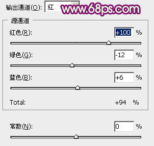 3、创建通道混合器调整图层,对红色进行调整,参数设置如图8,效果如图9。这一步增加图片的淡青色。
