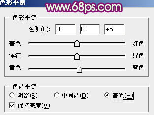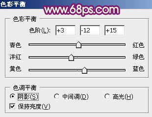 7、创建色彩平衡调整图层,对阴影、中间调、高光进行调整,参数设置如图20 - 22,效果如图23。这一步增加暗部蓝色,如果觉得蓝色还不够,可以按Ctrl + J 把当前色彩平衡调整图层复制一层,适当降低图层不透明度,效果如图24。