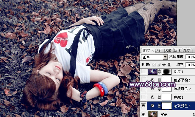 Photoshop调出草地美女图片经典暗调蓝红色(2)