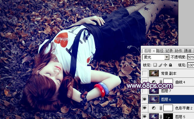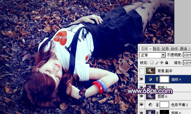Photoshop调出草地美女图片经典暗调蓝红色(7)