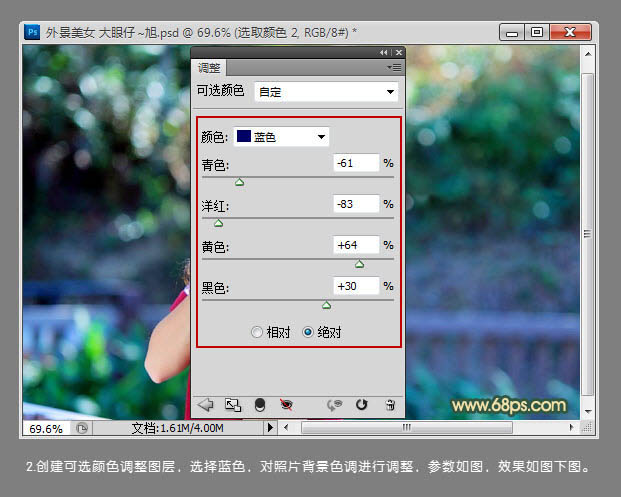 2、创建可选颜色调整图层,选择蓝色,对照片背景色进行调整,参数及效果如下图。