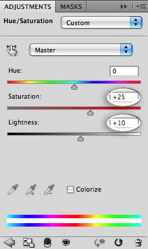 1、打开照片,点击图层面板底部的调整层按钮,选择色相/饱和度。饱和度25,明度10,参数及效果如下图。
