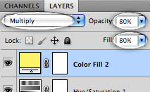 3、设置图层的混合模式为正片叠底,它的不透明度和填充度都改为:80%,如下图。
