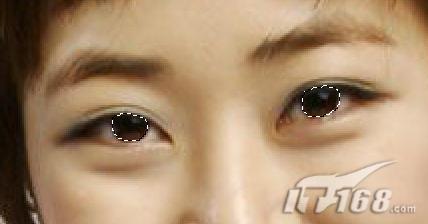 8、修饰眼睛的高光。选择工具箱中的画笔工具,在画笔选项中设置适当的画笔大小,并将不透明度设置为100%,在图层面板中新建图层,将前景色设置为白色,在眼睛高光处绘制,并在眼睛高光处加一点蓝色。
