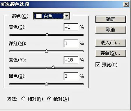1、用可选颜色工具分别修改照片的黄色,白色在照片中的色相,强调暖调,数值如图。