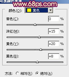 2、创建可选颜色调整图层,对黄、绿、中性、黑进行调整,参数设置如图4 - 7,效果如图8。这一步把背景绿色转为暗黄色。