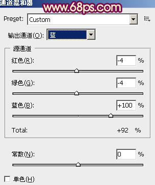 6、创建通道混合器调整图层,对红,蓝进行调整,参数设置如图17,18,效果如图19。这一步增加图片暖色。