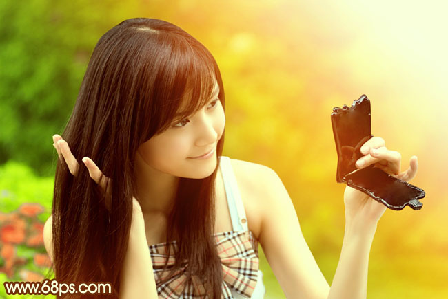 橙黄色虽然是比较刺眼的颜色,不过与较暗的绿色搭配也是不错的组合。处理的时候只需要把高光部分渲染成橙黄色,再稍微调整一下人物的肤色即可。