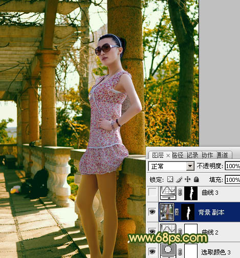 8、把背景图层复制一层,按Ctrl + Shift + ] 置顶,再按住ALt键添加图层蒙版,用白色画笔把人物部分擦出来,效果如下图。这一步修复人物部分的偏色。