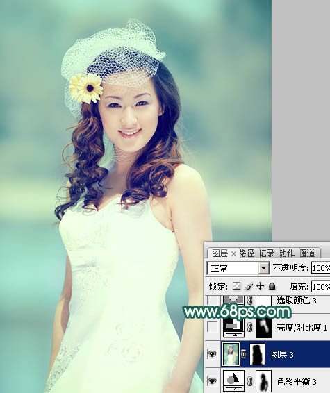 8、创建色彩平衡调整图层,对中间调,高光进行调整,参数设置如图25,26,确定后用黑色画笔把人物部分擦出来,效果如图27。这一步把背景颜色转为青色。