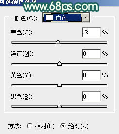11、创建可选颜色调整图层,对黄、白、黑进行调整,参数设置如图31 - 33,效果如图34。这一步微调人物肤色颜色。