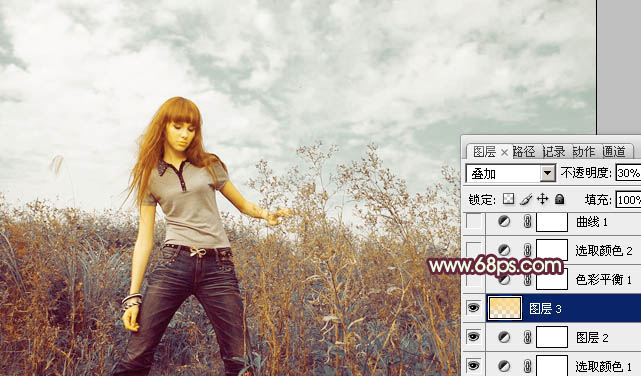 4、按Ctrl + Alt + 2 调出高光选区,新建一个图层填充橙黄色:#FBD780,混合模式改为“叠加”,不透明度改为:30%,效果如下图。这一步增加高光部分的橙黄色。