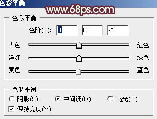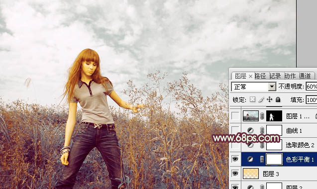 5、创建色彩平衡调整图层,对阴影、中间调、高光进行调整,参数设置如图11 - 13,确定后把图层不透明度改为:60%,效果如图14。这一步增加图片的红褐色。