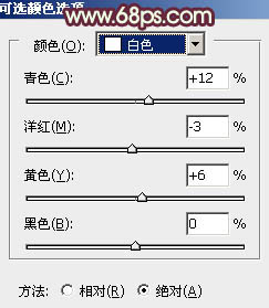 6、创建可选颜色调整图层,对黄,白进行调整,参数设置如图15,16,效果如图17。这一步增加图片高光部分的青色。