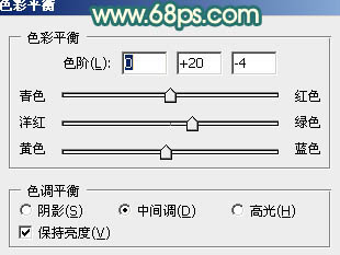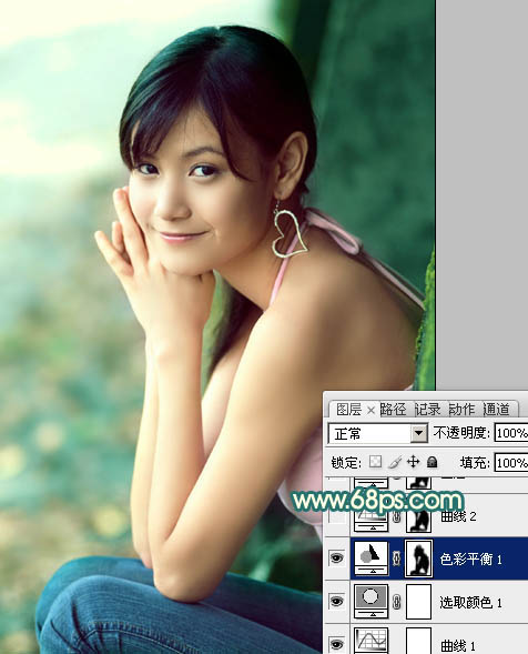 4、创建色彩平衡调整图层,对阴影、中间调、高光进行调整,参数设置如图11 - 13,确定后用黑色画笔把人物部分擦出来,效果如图14。这一步把背景颜色调成青绿色。