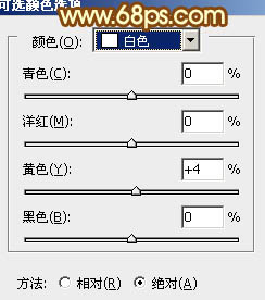 5、创建可选颜色调整图层,对黄、绿、白、中性色进行调整,参数设置如图14 - 17,确定后把图层不透明度改为:50%,效果如图18。这一步增加背景部分的青绿色。