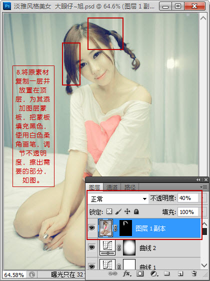 8、将原素材复制一层,放置在顶层,为其添加图层蒙版,把蒙版填充黑色,使用白色柔角画笔,调节不透明度,擦出需要的部分,如下图。