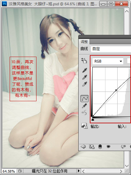 9、人物肤色偏黄,羽化想处理淡雅风格,所以创建曲线调整图层,适当调亮。
