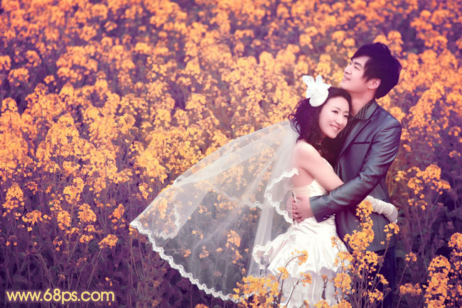 本教程介绍暖色婚片的调色方法。大致过程:先从背景颜色调起,可以用通道替换或调色工具把背景主色转为暖色,然后微调人物部分的颜色,大致融合后微调一下整体颜色及高光颜色即可。