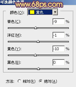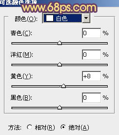 2、再创建可选颜色调整图层,对红、黄、白进行调整,参数设置如图5 - 7,效果如图8。这一步增加暖色亮度,并把人物肤色转为淡紫色。