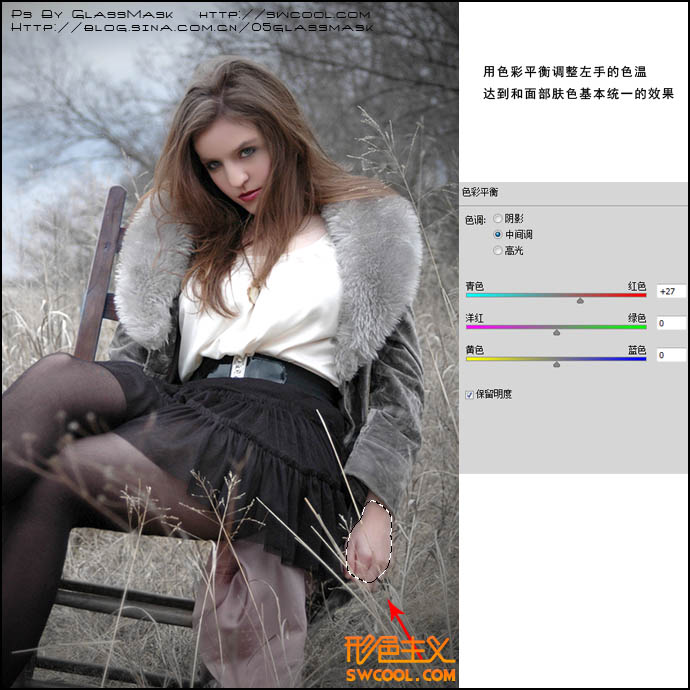 3、同样的方法用色彩平衡调整左手的色温,打造和面部肤色基本统一的效果。