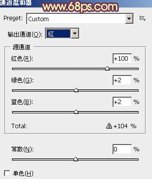 10、创建通道混合器调整图层,对红色进行调整,参数设置如图30,确定后把图层不透明度改为:60%,效果如图31。这一步增加图片的红色。