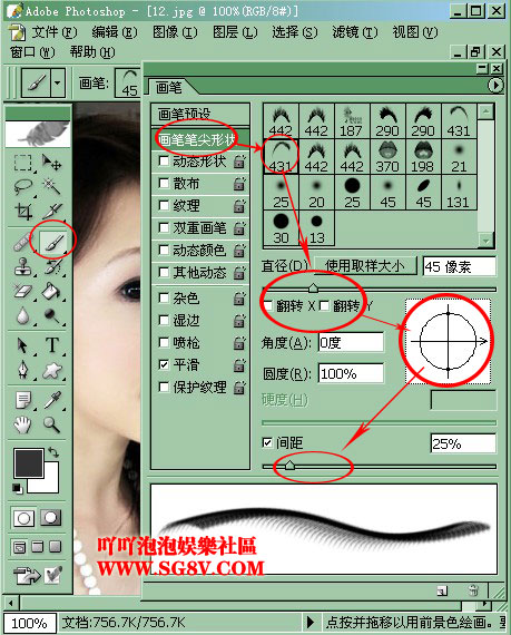 2、接下来现在按F5弹出画笔设置对话筐。 选择笔刷(自己喜欢的眉毛)。然后按照前面眼睫毛所讲的调节好眉毛笔刷的大小左右高低和倾斜浓度密度。