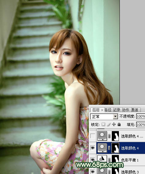 Photoshop调出楼梯边美女图片甜美的青绿色(7)
