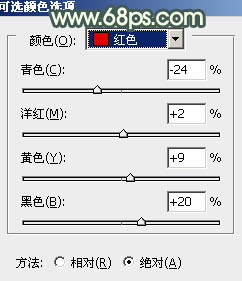 5、再创建可选颜色调整图层,对红、黄、黑进行调整,参数设置如图8 - 10,效果如图11。这一步只保留人物肤色部分的红色,其它颜色都转为黄灰色。
