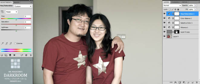 调色相饱和度的一大优点是可以对不同的颜色通道进行色相偏移与饱和度、明度更改,在本图中,整体色相饱和度并没有修改,但对红色通道的饱和度进行了幅度很小的降低处理。