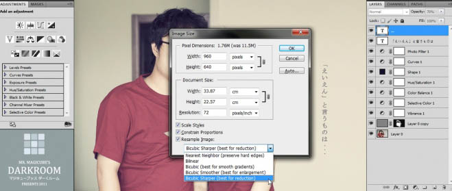 13、如果想要缩图,可以试试图像大小中的采样位置的最后一个选项重定图像像素中的两次立方较锐利(适用于缩小),这个插值方法比较适合缩图使用,在缩图的过程中可以得到进一步的锐化效果。