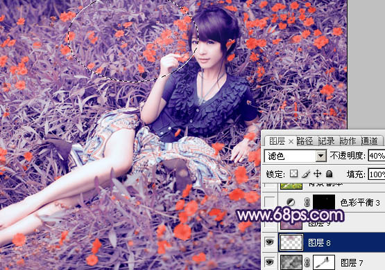 12、新建一个图层,混合模式改为“滤色”,把前景颜色设置为暗紫色:#A77D92,用画笔把下图选区部分涂上高光,再适当降低图层不透明度,效果如下图。