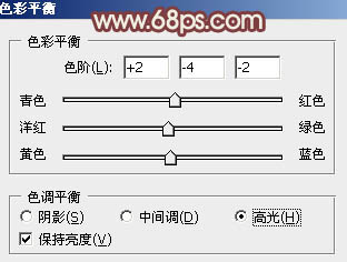 4、创建色彩平衡调整图层,对阴影,高光进行调整,参数设置如图8,9,效果如图10。这一步增加图片暗部的紫褐色。