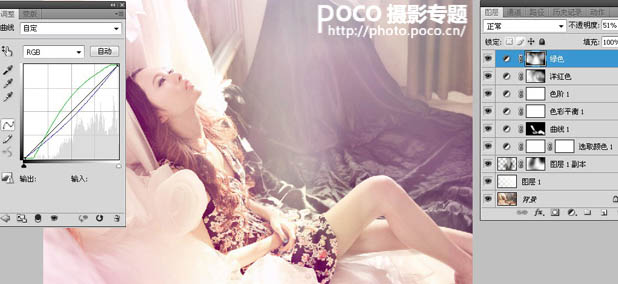 9、再次新建调整曲线,重点调整绿色通道,效果如图, 调出你想要的颜色!然后在蒙版里擦拭一下,单独擦出局部,降低透明度。