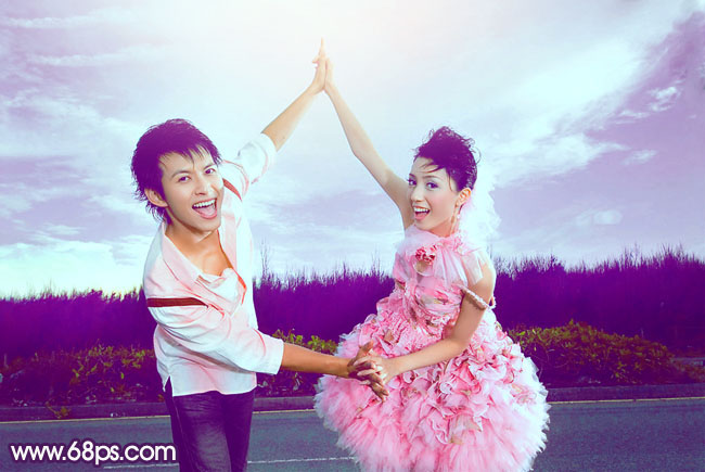 素材图片中人物服饰为紫色,可以搭配的颜色也很多,最融合的就是用相同的颜色紫色。可以用调色工具把背景部分都调为蓝紫色或紫色,然后加强高光,暗部及人物部分颜色即可。