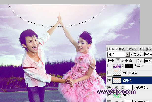 9、新建一个图层,用椭圆选框工具拉出下图所示的选区,羽化60个像素后填充淡橙色:#FFCCA4,混合模式改为“滤色”,效果如下图。这一步增加图片的高光。