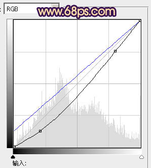 5、创建曲线调整图层,对RGB,蓝色进行调整,参数设置如图14,确定后把蒙版填充黑色,用白色画笔把左下角部分擦出来,增加图片的暗部,效果如图15。
