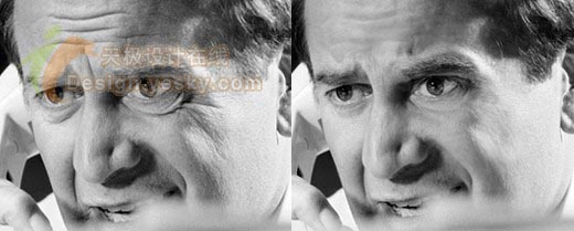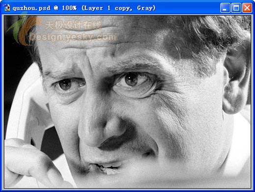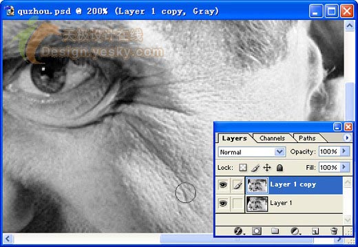 3. 下面就可以开始去除皱纹了,在开始操作前,最好在复制的那一层上操作,万一不满意,恢复起来方便。要边操作边根据皱纹的粗细和深浅调整笔刷的大小和压力值。要注意两点,一是要把图像放大来做,这样可以很清楚地看到图中形成皱纹的深色部分,准确地进行模糊,少损失细节。二是尽量从皱纹的末稍顺着皱纹的走向开始涂抹,这样会更自然。