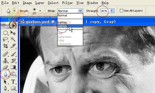 2. 根据我们上面的对皱纹的分析,点击工具条中的模糊工具,选取一个柔角的笔刷,然后在上面的模式一栏里选择下拉菜单中的lighten变亮,因为lighten是影响图中色调较暗的部分。不要忘记设置笔刷的压力值,可以根据你的图片具体情况来设定,一般不超过50%。