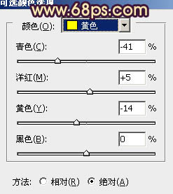 2、创建可选颜色调整图层,对黄、绿、白、黑进行调整,参数设置如图4 - 7,效果如图8。这一步把背景绿色转为黄褐色。
