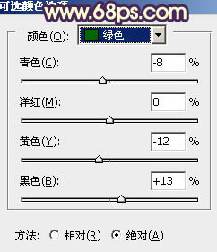 6、创建可选颜色调整图层,对黄、绿、青、白进行调整,参数设置如图11 - 14,效果如图15。这一步适当把图片颜色调暗。