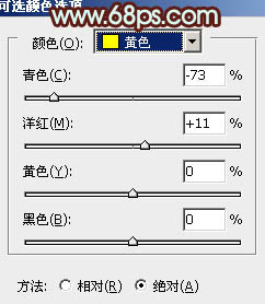 2、创建可选颜色调整图层,对黄,绿进行调整,参数设置如图6,7,确定后把蒙版填充黑色,用白色画笔把背景部分的树木擦出来,效果如图8。这一步调整树木颜色。