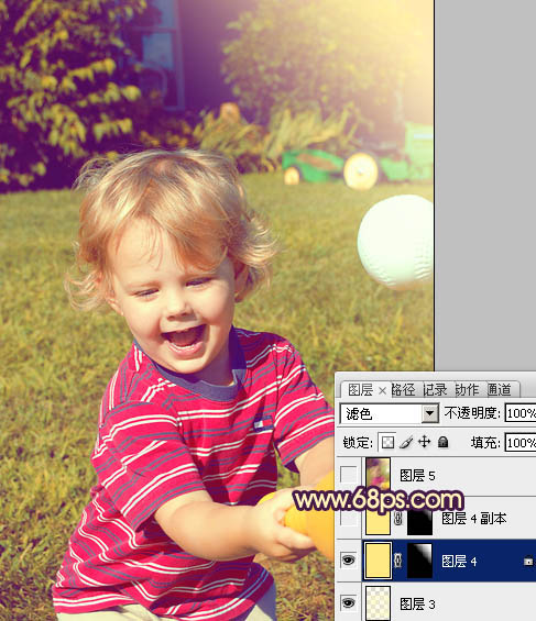 11、新建一个图层,填充淡黄色:#FFE983,混合模式改为“滤色”,按住Alt键添加图层蒙版,用白色画笔把右上角部分擦出来,增加图片的高光,效果如下图。