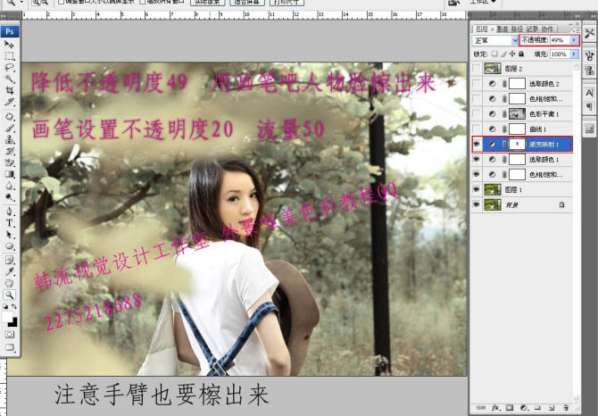 5、将渐变映射层不透明度设为49%,用黑色画笔,画笔不透明度20%,流量50%,在蒙版里擦出人物的皮肤。