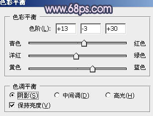 5、创建色彩平衡调整图层,对阴影,高光进行调整,参数设置如图11,12,效果如图13。这一步加强暗部和高光颜色。人物部分会有一点颜色失真,后面会修复。