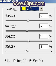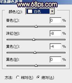 4、创建可选颜色调整图层,对黄,白进行调整,参数设置如图11,12,效果如图13。这一步微调黄色部分及增加图片的高光颜色。
